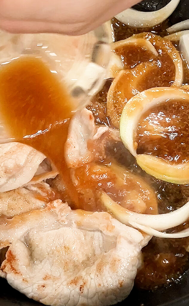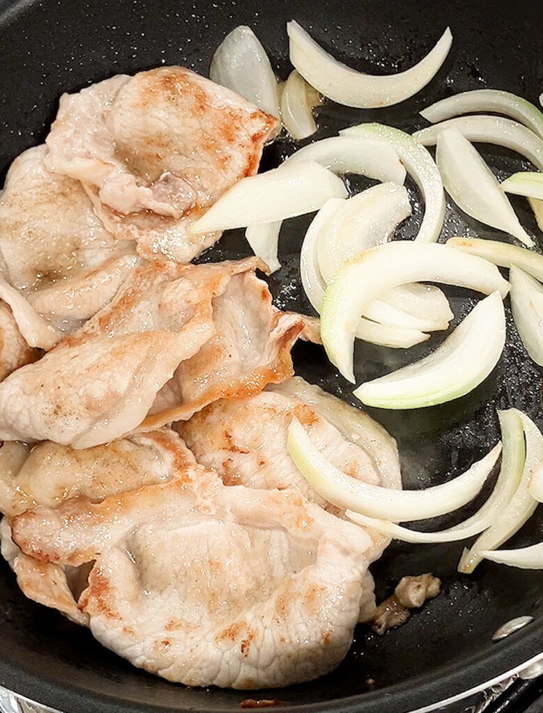 豚肉に焼き色がついたら裏返して少し寄せ、玉ねぎを加えて炒めます。