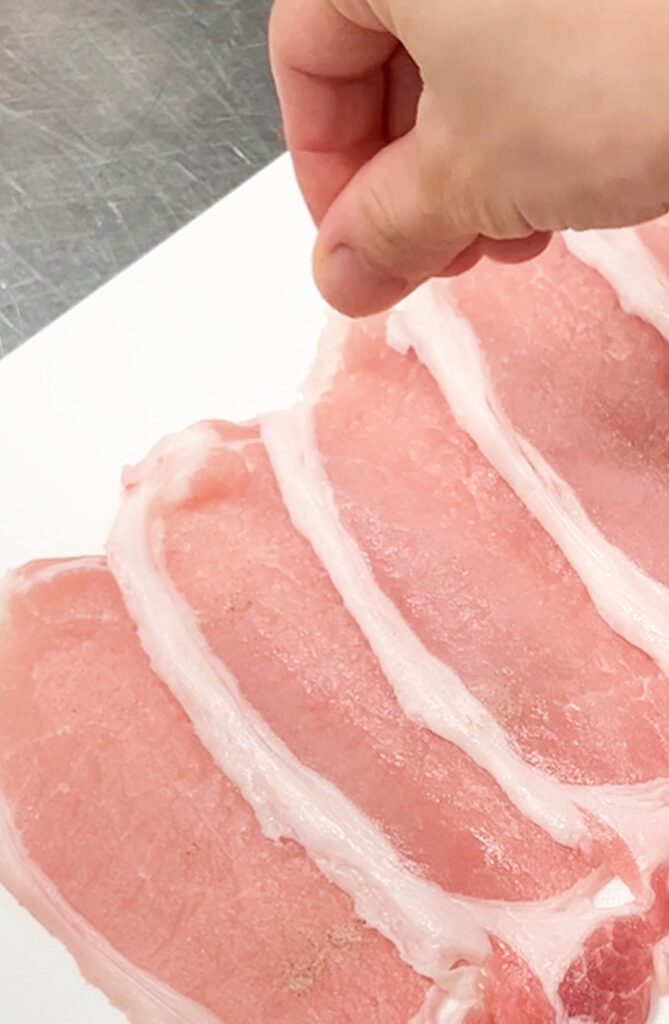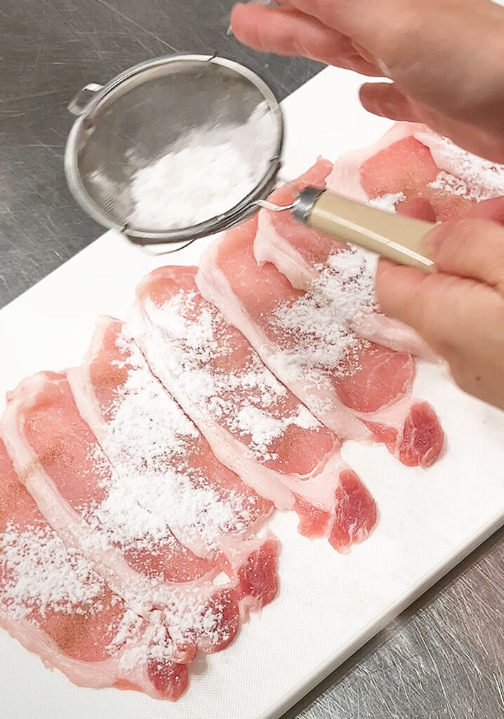 豚肉は片面に塩コショーを振ります。ここで下味をつけておきます。
