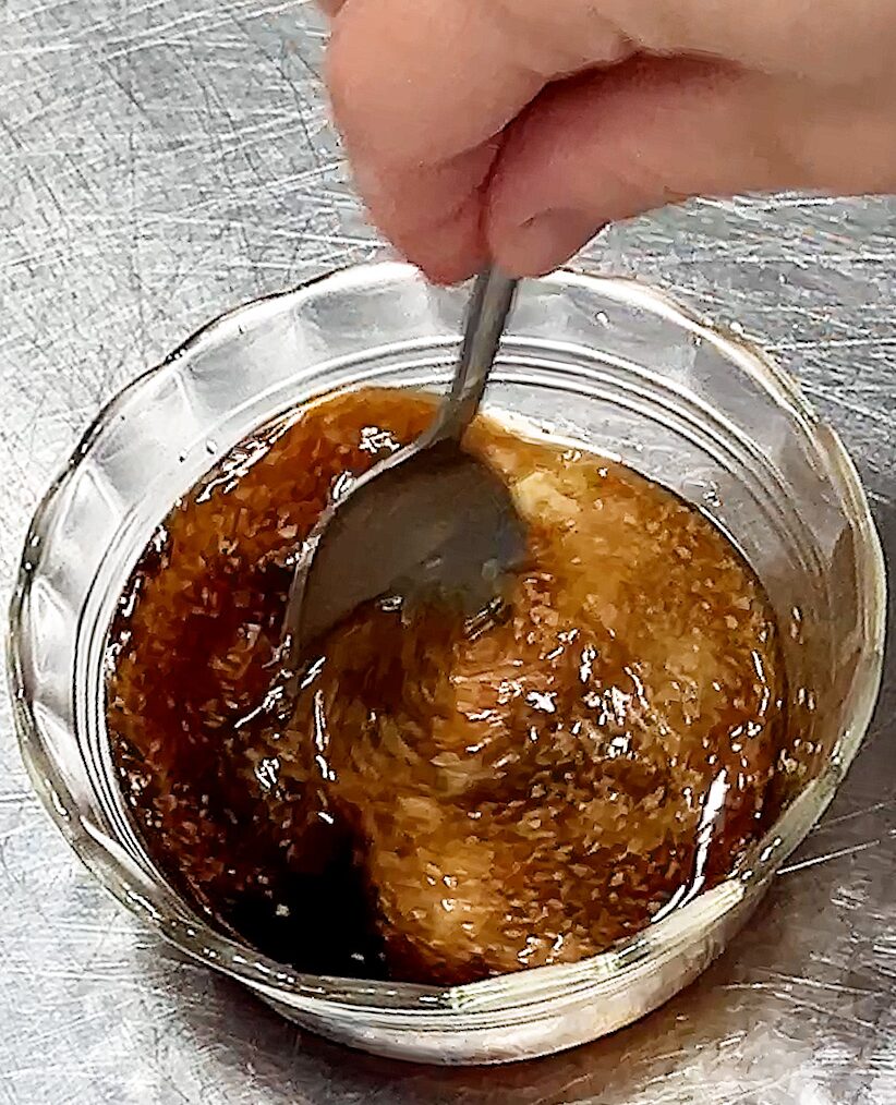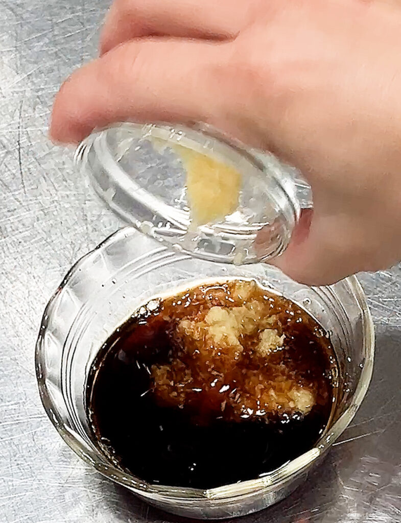 A【濃口醤油・酒・みりん・おろししょうが】を混ぜ合わせて、合わせ調味料を作ります。