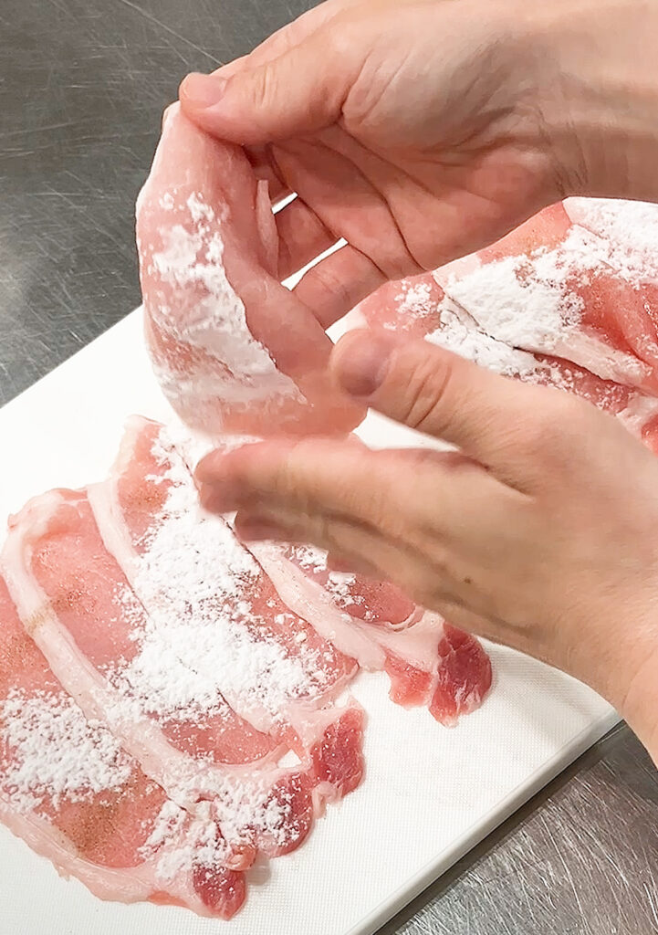 片栗粉をまぶすことで、肉汁が流れ出るのを防ぎ、ジューシーに仕上がります。