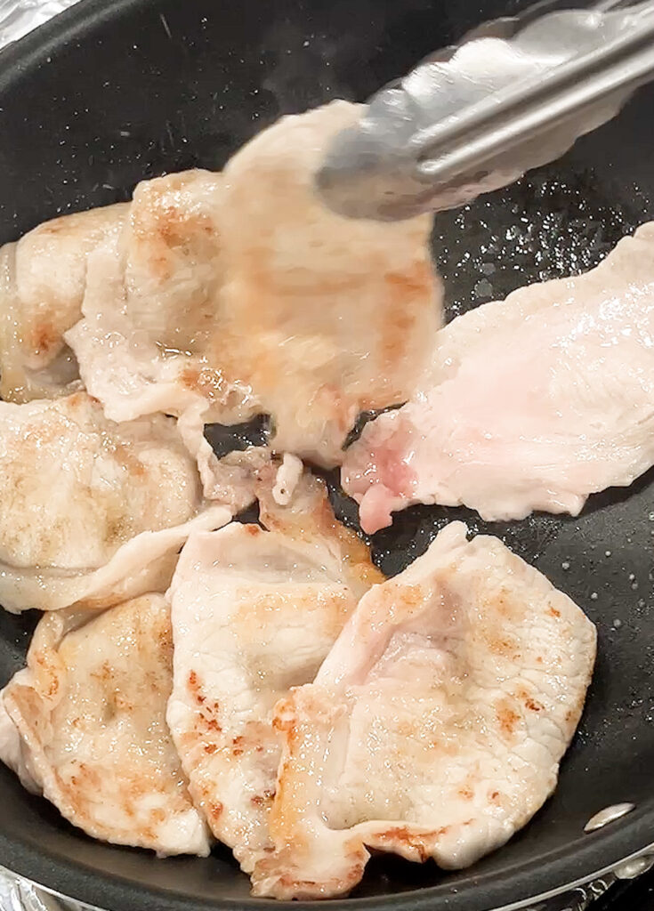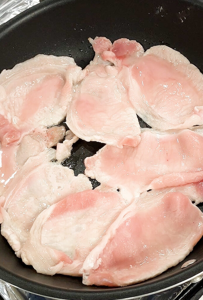 フライパンにサラダ油を熱し、できるだけ重ならないように豚肉を並べて焼きます。