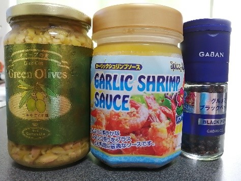 それと調味料でガーリップシュリンプソース、オリーブオイル、ブラックペッパー。