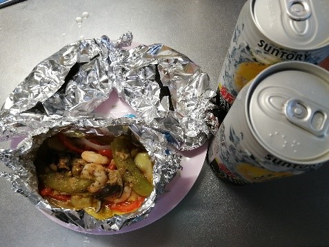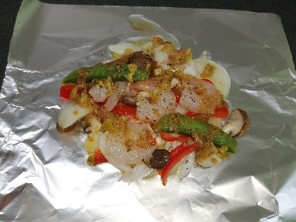 ①アルミホイルの上に野菜とエビをのせて、調味料を適量まぶして包みます。